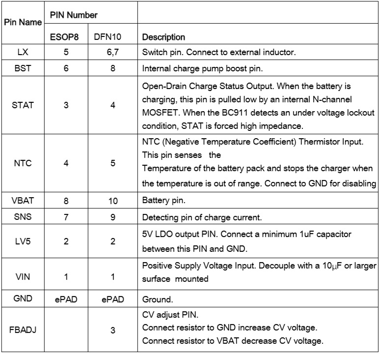 產(chǎn)品名稱: BC911(4.2V/4.35V/4.4V充滿截止電壓可調(diào)、3.5A單節(jié)鋰電充電管理IC)