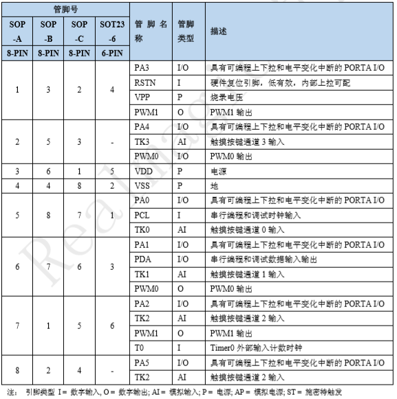 ◆ GPIO ┄ 具有獨立方向控制的 6 個 I/O 引腳:PA 口 6 個 ┄ PA3:外部復(fù)位,當設(shè)定為輸出時為真開漏輸出模式 ┄ PA 端口獨立的可編程弱上/下拉,PA 口除 PA3 外均可設(shè)定為偽開漏輸出 ┄ PA4/PA5 為高驅(qū)動口,能直接驅(qū)動 LED