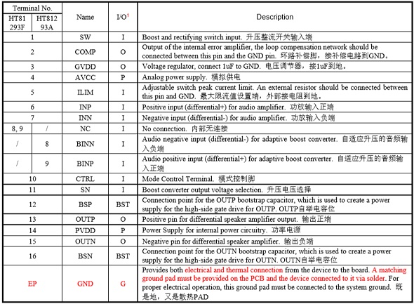 HT81293 18W/3.0V-12V(內(nèi)置升壓至12.3V)/4Ω ESOP-16 3.0V-12V 3.0V-12V寬泛輸入電壓內(nèi)置升壓18W單聲道D類音頻功放芯片,涵蓋單節(jié)雙節(jié)鋰電應(yīng)用