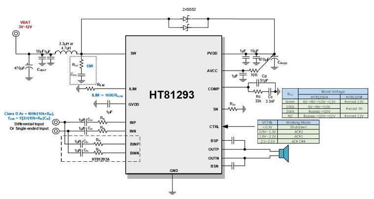 HT81293A內(nèi)置可動(dòng)態(tài)調(diào)節(jié)的升壓,可以提供一個(gè)適應(yīng)不同輸出功率的電壓給D類功放,其可大幅提高系統(tǒng)效率,延長電池續(xù)航時(shí)間。HT81293F則內(nèi)置固定升壓,提供一個(gè)固定9V或12V的升壓給D類功放。HT81293可配置升壓限流值,以防止過大的電流尖峰。