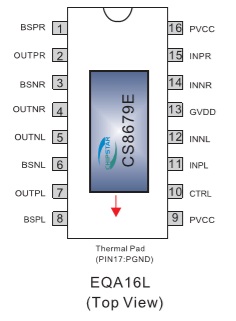 CS8679E提供干小的EQA16封裝形式,封裝尺寸和ESOP8E一致,可以為客戶節(jié)省可觀的PCB面積,其額定的工作溫度范圍為-40℃至85℃。