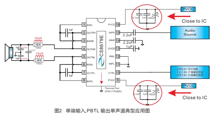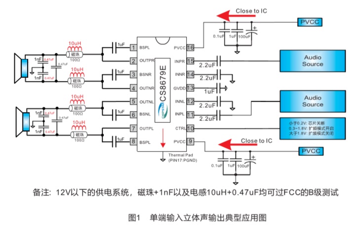 CS8679E內(nèi)置了過流保護(hù),短路保護(hù)和過熱保護(hù),有效的保護(hù)芯片在異常的工作條件下不被損壞。CS8679E可以驅(qū)8低至4Ω 負(fù)載的揚聲器 ,最高可提供33W的連續(xù)功率;CS8679E具有高達(dá)92%的效率,使得在播放音樂的時候無需要額外的散熱器。