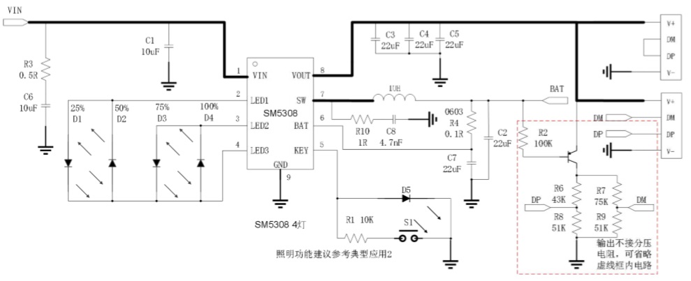 SM5308是一款集成升壓轉(zhuǎn)換器、 鋰電池充電管理、電池電量指示的多功能電源管理 SOC,為移動(dòng)電源提供完整的電源解決方案。