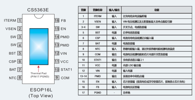 CS5363 CS5363E是一款20V耐壓,1~4節(jié)鋰電池或1~5節(jié)磷酸鐵鋰電池異步降壓型充電管理IC。 集成功率MOS, 具有最大4A的充電電流能力,充電電流可以通過(guò)外部電阻靈活可調(diào)。恒壓充電電壓由外部電阻分壓網(wǎng)絡(luò)設(shè)置,實(shí)現(xiàn)對(duì)多類型多節(jié)電池的充電管理。 ESOP-16 3.6V-20V 具有太陽(yáng)能板最大功率點(diǎn)跟蹤MPPT功能,NTC功能4A異步降壓多節(jié)鋰電池充電管理IC
