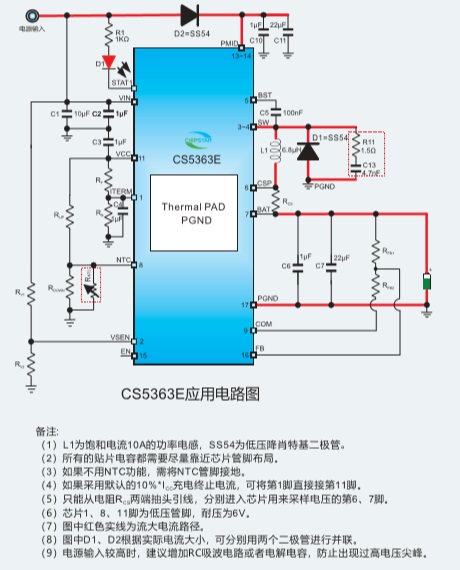 CS5363E具有完善的保護(hù)功能,包括輸入欠壓和過(guò)壓保護(hù)、電池充電過(guò)壓和短路保護(hù)、電池溫度保護(hù)、芯片過(guò)溫保護(hù)、充電超時(shí)保護(hù)。此外芯片通過(guò)外接的LED指示燈,可對(duì)充電過(guò)程實(shí)現(xiàn)全程監(jiān)控。采用ESOP-16封裝。