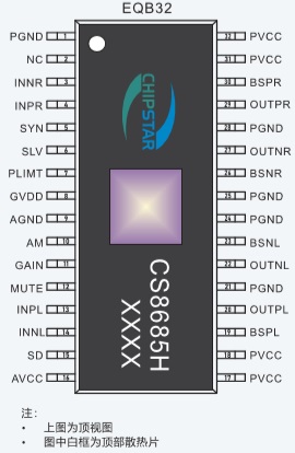 CS8685H提供了特殊的EQB32封裝形式供客戶選擇,合適的封裝尺寸為客戶安裝散熱器件提供了最大的方便,其額定的工作溫度范圍為-40℃至85℃。