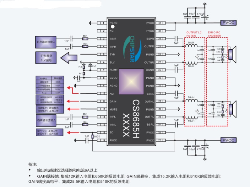 當前位置:首頁->產品展示->功放IC->CS8685(2x80W雙聲道大功率D類音頻功放IC) |