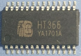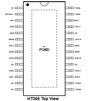 HT366 2×22W(VDD=14V, RL=4Ω, THD+N=10%)或34W (VDD=16V, RL=4Ω, THD+N=10%) TSSOP-28 4.5V-16V 具有防破音功能的免電感濾波2×20W D類立體聲音頻功放 TPA3110/AD52068/CS3817