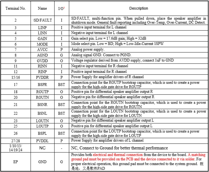 HT328 2X40W/24V/8Ω或80W/24V/4Ω TSSOP-28 4.5V-26V 免電感濾波2×30W D類立體聲音頻功放 AD52090/TPA3110