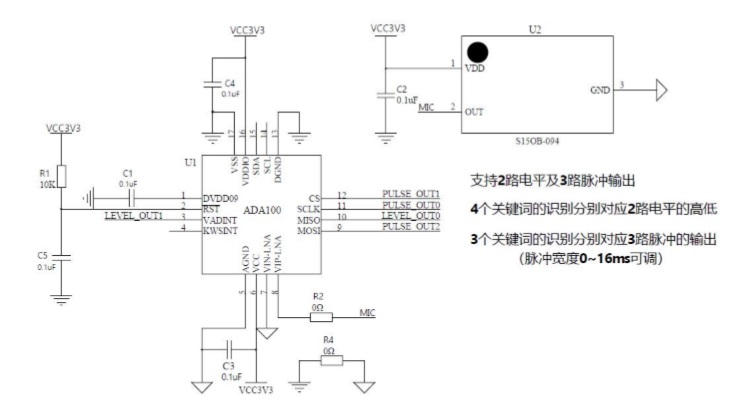 該電路適用于有 I2C 或 SPI 通信的方案,最大支持 30 個關(guān)鍵詞的識別,當有語音時,VADINT(PIN3)輸 出高脈沖指示檢測到人聲;當識別到關(guān)鍵詞時,KWSINT(PIN4)輸出一個納秒級別的脈沖,提示此時該讀取 ADA100 寄存器,提取識別到的關(guān)鍵詞。