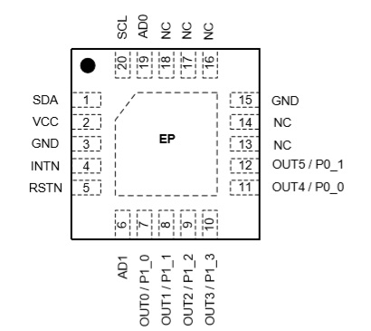 通電后,6個(gè)IO端口配置默認(rèn)為GPIO輸出,默 認(rèn)狀態(tài)根據(jù)AD0和AD1決定。所有配置為輸入 的IO端口都會(huì)持續(xù)監(jiān)控狀態(tài)變化,并具有8μs 的防抖動(dòng)時(shí)間,IO口的變化由INTN輸出指示。