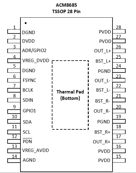 ACM8685 2×32W, 立體聲輸出(8Ω, 22V, THD+N = 10%) TSSOP-28 4.5V-26.54 2×26W立體聲/52W單聲道、內(nèi)置DSP虛擬低音等多種音頻處理效果、數(shù)字輸入音頻功放芯片 ACM8622/ACM8625/ACM8628