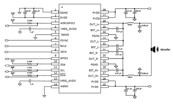 I2S數(shù)字輸入33W立體聲D類音頻功放芯片、內(nèi)置DSP小音量低頻增強(qiáng)等算法 |