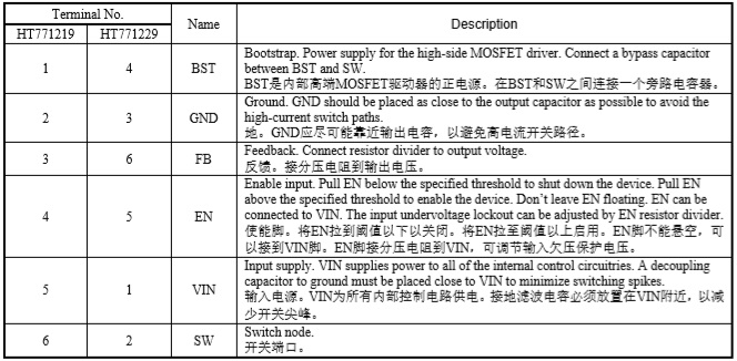 HT77221/HT77211 輸入電壓范圍:4.0V-30V ; 輸出電壓范圍:0.8V-13V ; HT77221: 2A降壓,內置100mΩ和60mΩ功率管 ; HT77211: 1.2A降壓,內置100mΩ和60mΩ功率管 SOT23-6 4.0V-30V 4.0V-30V輸入、2A/1.2A同步降壓轉換器 HT771219