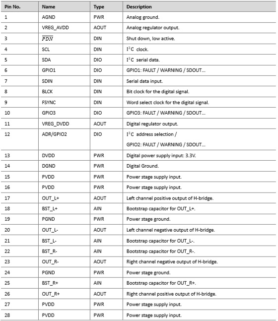 - THD+N ≤ 0.03% :1W, 1kHz, PVDD = 12V