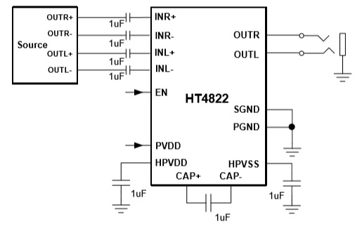 HT4822是一款無需輸出隔直電容的立體聲耳機 放大器。