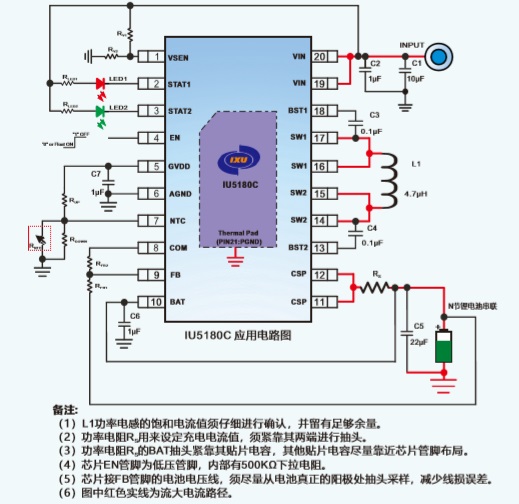 IU5180C通過調(diào)節(jié)電池外部反饋電阻的分壓比例,得到不同的恒壓充電電壓值,從而適配不同節(jié)數(shù)和規(guī)格的鋰電池。