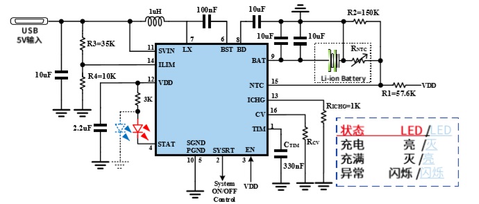 ■ LED指示燈使用時需接限流電阻到VDD,推薦3K。如需使用雙燈方案,必須按照圖中LED燈顏色配置,請購買對應(yīng)顏色LED燈進(jìn)行實(shí)驗(yàn),保 證兩個燈導(dǎo)通電壓不在一個電壓下,充電時紅燈亮,藍(lán)燈滅;充滿時藍(lán)燈亮,紅燈滅;異常時紅燈藍(lán)燈交替閃爍。