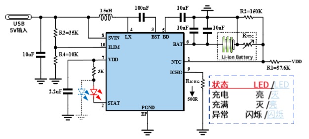 ■ LED指示燈使用時(shí)需接限流電阻到VDD,推薦3K。如需使用雙燈方案,必須按照圖中LED燈顏色配置,請購買對應(yīng)顏色LED燈進(jìn)行實(shí)驗(yàn),充 電時(shí)紅燈亮,藍(lán)燈滅;充滿時(shí)藍(lán)燈亮,紅燈滅;異常時(shí)紅燈藍(lán)燈交替閃爍。