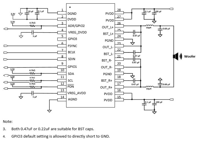 I2S數(shù)字輸入33W立體聲D類音頻功放芯片、內(nèi)置DSP小音量低頻增強(qiáng)等算法 |