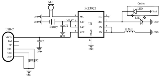 M13023是一款高度集成、超低功耗的少管腳電子煙ASIC,休眠時待機功耗低于5μA。芯片內(nèi)部集成了鋰電充電管理、咪頭檢測、LED 直接驅(qū)動、電熱絲開關(guān)MOS、12-bit ADC等功能模塊,支持最高10W的恒功率輸出和恒壓輸出,支持±1℃的溫度檢測精度。內(nèi)置的鋰電充電管理模塊,支持涓流充電、恒流充電和恒壓充電。利用M13023,外部僅需咪頭和1個發(fā)光管,即可組成電子煙的控制方案。