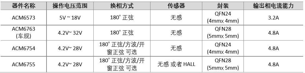 ACM6763 的高集成度以及精簡外圍特別適用于高功率密 度、小尺寸、靜音要求高的三相無刷電機(jī)驅(qū)動器應(yīng)用場景.