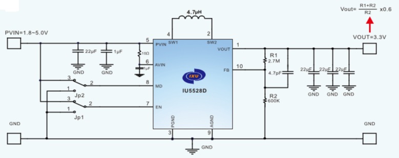 IU5528D由電流模PWM控制環(huán)路,誤差放大器,比較器和功率開關(guān)等模塊組成。該芯片可在較寬負(fù)載范圍內(nèi)高效穩(wěn)定的工作.IU5528D的輸入電壓為1.8V至5.0V提供可調(diào)輸出電壓為(1.2V至5V) .在輸出電壓為3.3V的情況下, 輸入從3.0V到5.0V,它能提供最大2.6A的負(fù)載電流. IU5528D可以通過調(diào)整兩個(gè)外加電阻來設(shè)定輸出電壓.