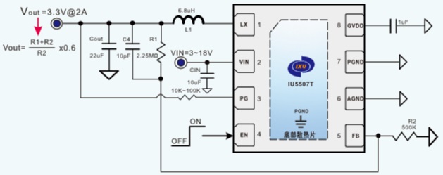 產(chǎn)品名稱: IU5507(3V-18V輸入電壓、2A電流、低功耗同步降壓芯片)