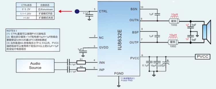 IU8632E內(nèi)置了過流保護,短路保護和過熱保護,有效的保護芯片在異常的工作條件下不被損壞。IU8632在供電電壓在15V以內(nèi),可以驅(qū)動低至4Ω負(fù)載的揚聲器,最高可提供22W的連續(xù)功率;在供電電壓16V以內(nèi),可以驅(qū)動低至8Ω 負(fù)載的揚聲器,提供13W的連續(xù)功率.IU8632具有高達92%的效率,使得在播放音樂的時候不需要額外的散熱器。