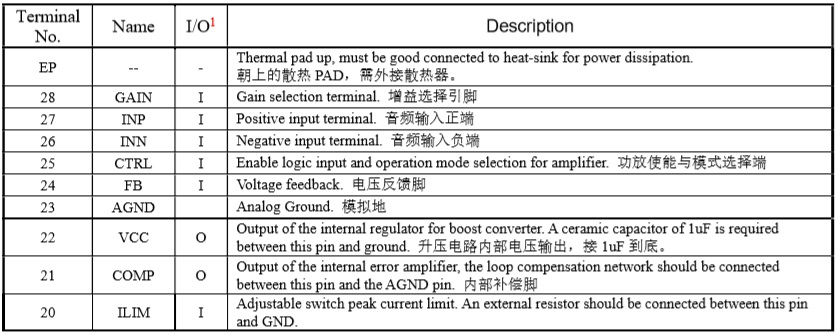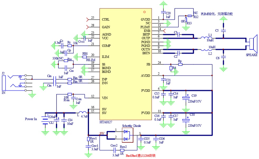 此外,HTA8127內(nèi)部集成免濾波器調(diào)制技術(shù), 能夠直接驅(qū)動揚聲器,內(nèi)置的關(guān)斷功能使待機電流最小化,還集成了輸出端過流保護、片內(nèi) 過溫保護、輸入電源欠壓異常保護、升壓電壓過壓保護等功能。