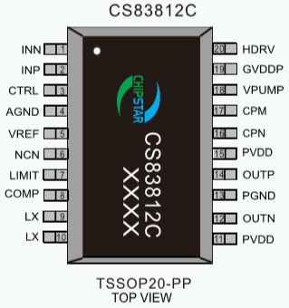 CS83815 PO at 10% THD+N, VIN = 6.5-12.6V RL = 4 Ω+22uH 31W TSSOP-20 6.5V-12.6V 適用于2-3節(jié)雙節(jié)鋰電池應(yīng)用、AB/D類切換、升壓模式同步異步可選,自適應(yīng)內(nèi)置升壓?jiǎn)温暤?5W功放IC CS83812