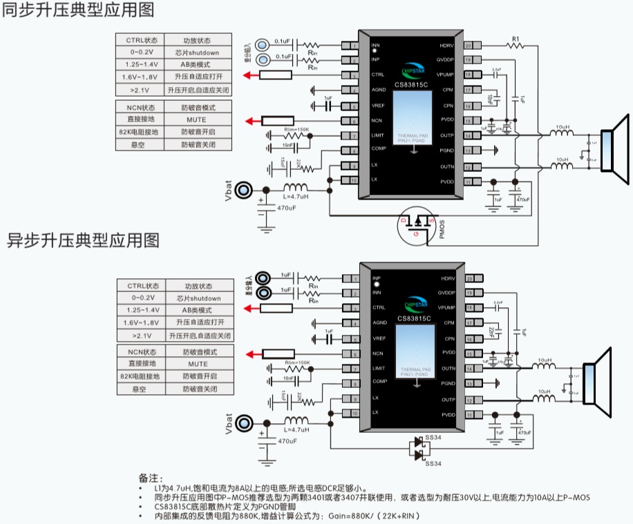 CS83815C是一款適用于2-3節(jié)鋰電池應(yīng)用,帶防破音,AB/D切換,升壓模塊同步異步可選,并且升壓模塊具備自適應(yīng)升壓功能的R類單聲道音頻功率放大器。