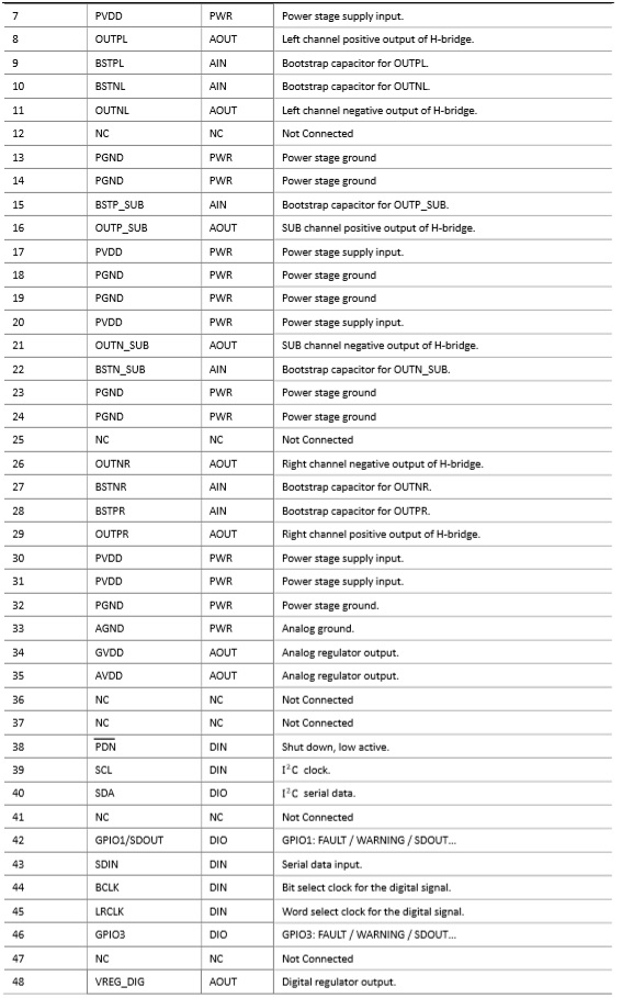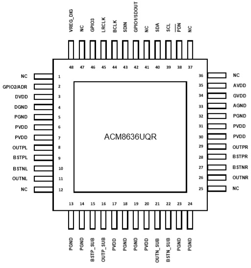 ACM8636 2×30W+40W, 2.1通道 (2×8Ω+4Ω, 24V, THD+N =1%) QFP-48 4.5V-26.4V 內(nèi)置DSP、60W+2X30W大功率I2S輸入2.1聲道數(shù)字功放IC