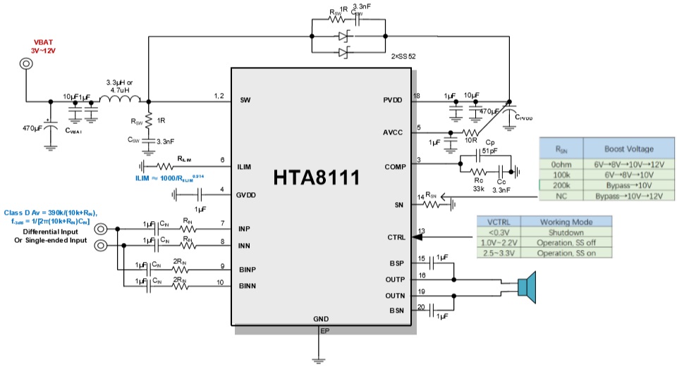 HTA8111的增益為32dB。 此外,HTA8111集成了輸出端過流保護(hù)、片內(nèi)過溫保護(hù)、升壓過壓保護(hù)等功能。