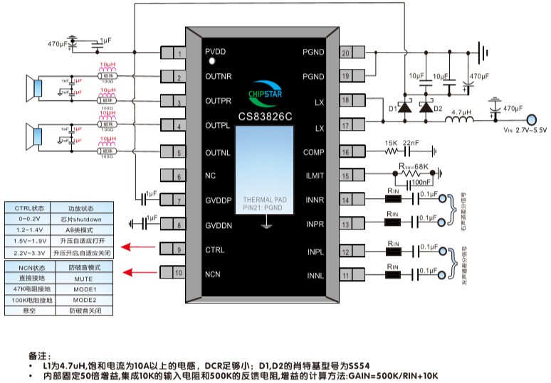 CS83826C內置了過流保護,短路保護和過熱保護,有效的保護芯片在異常的工作條件下不被損壞。
